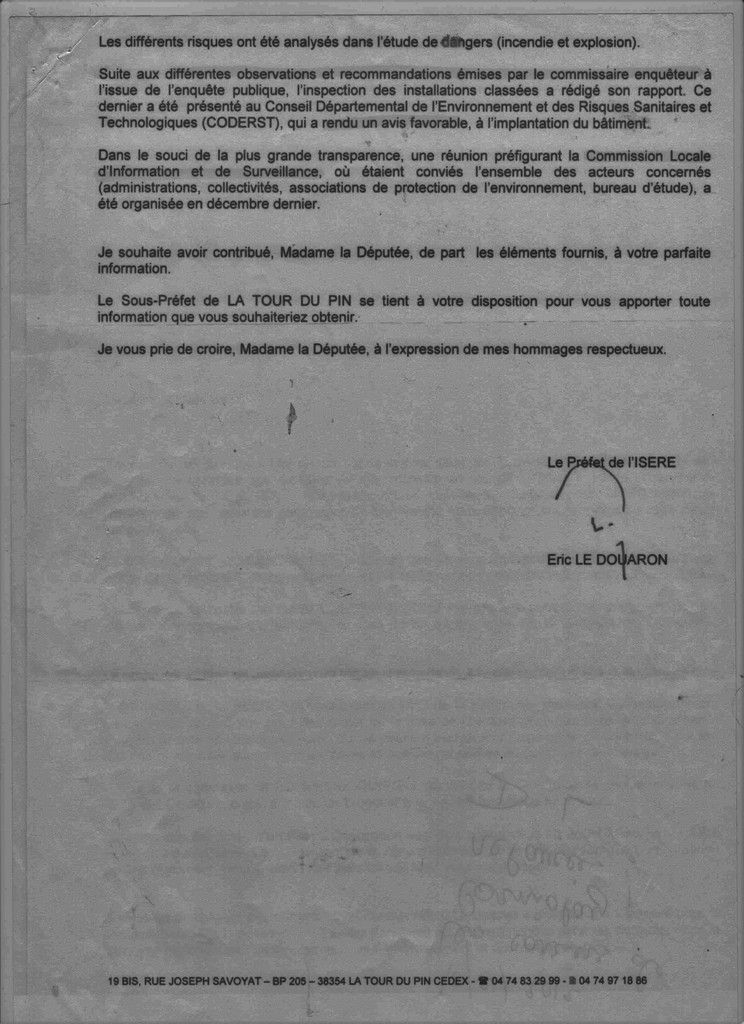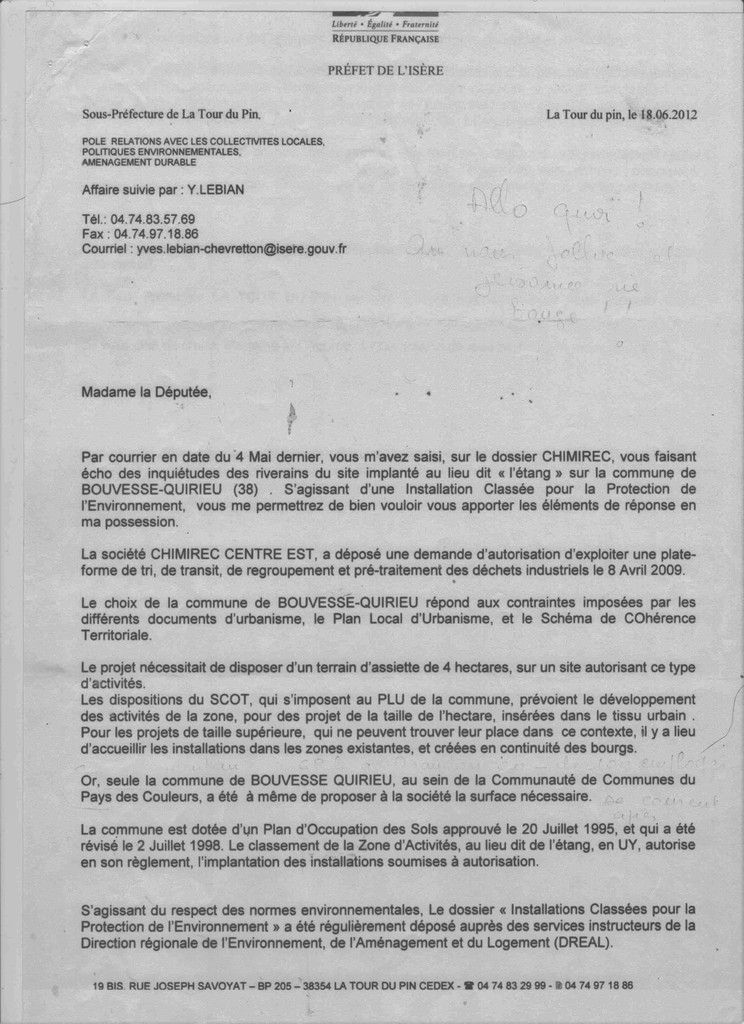 Lettre du Préfet de l'Isère à Mme la Députée M. RIVASI concernant l'implantation de CHIMIREC à Bouvesse Quirieu, seule commune ayant d'après lui la superficie pour accueillir cette installation classée ...